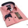 Dessin: Streep smal beige bruin/wit met donker blauwe boord en manchetten